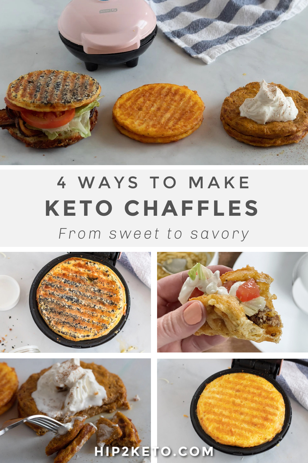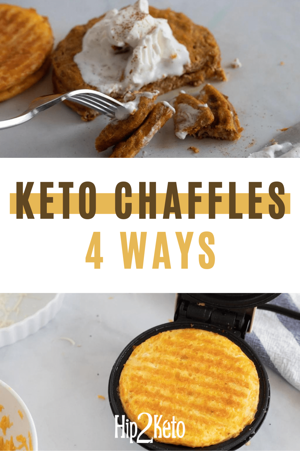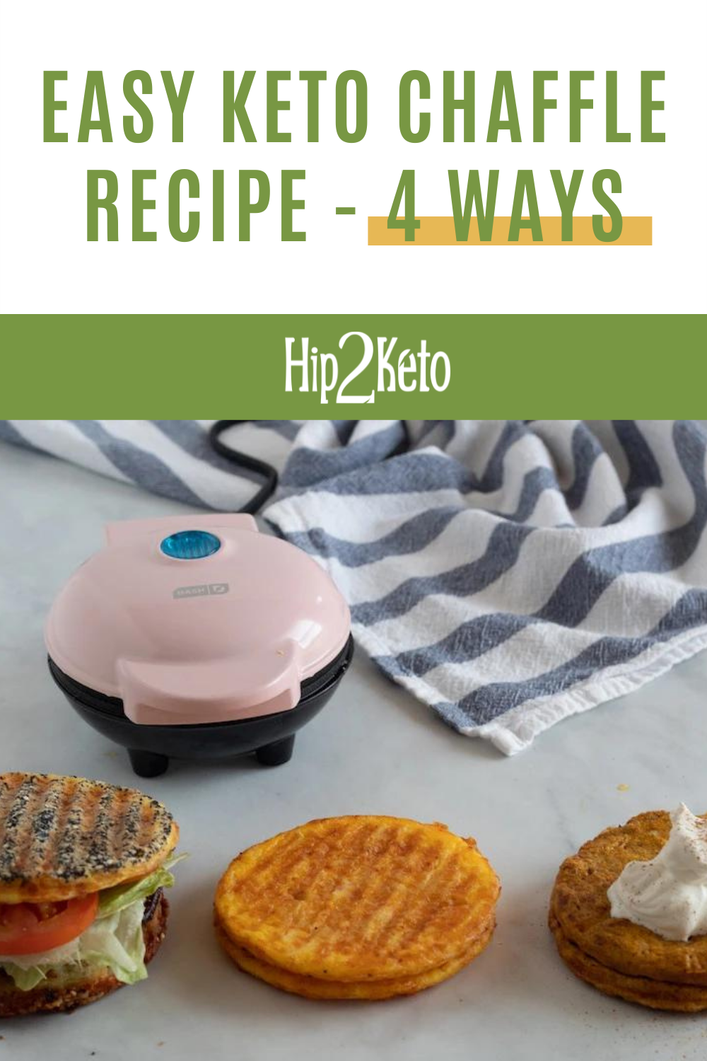 I’ve put together four easy, keto chaffle recipes for you: a crispy chaffle, a basic chaffle, a dessert chaffle, and a taco chaffle.