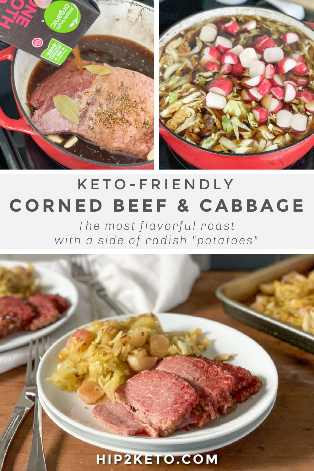 Three ounces of corned beef contain just 0.4g of carbs! The potatoes would be the biggest carb hurdle, so to make the sides for our corned beef keto friendly, I cooked radishes right along with the cabbage to get that potato fix; it turned out amazing. Thank you to Love Carb Love for the inspiration!