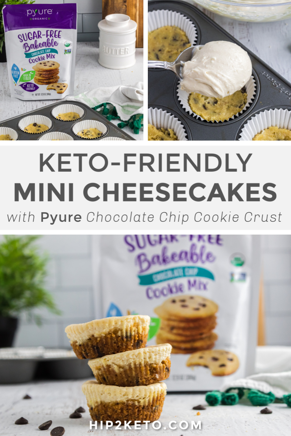 These keto mini cheesecakes are so easy to make (thanks to Pyure’s Chocolate Chip Cookie Mix) and so delicious, with a luscious layer of creamy cheesecake filling.