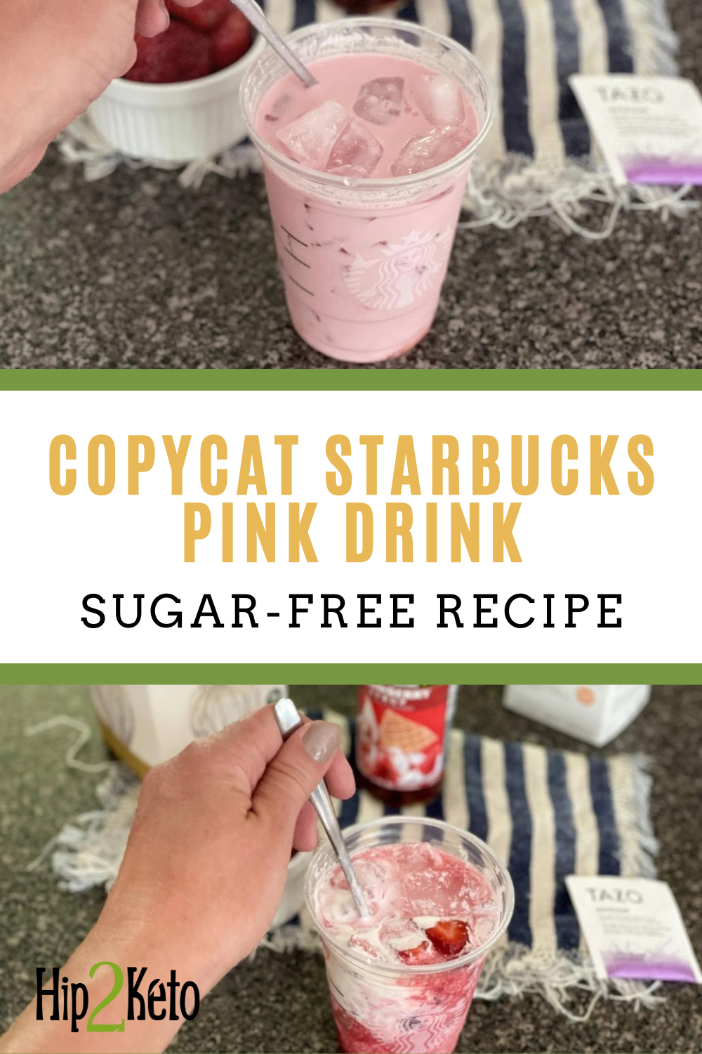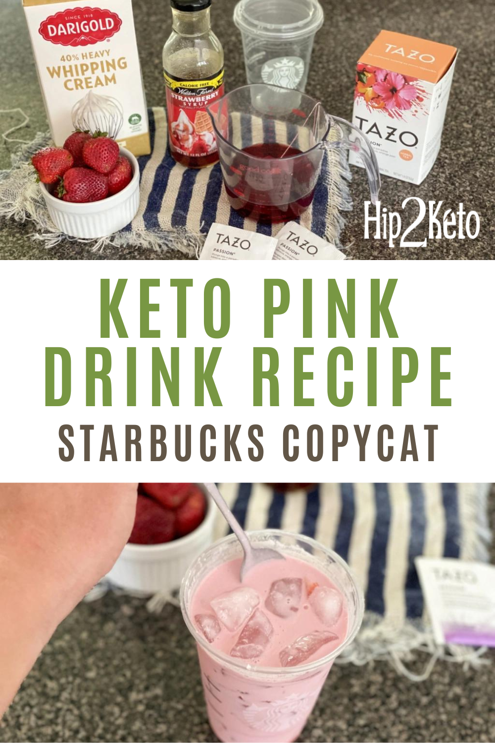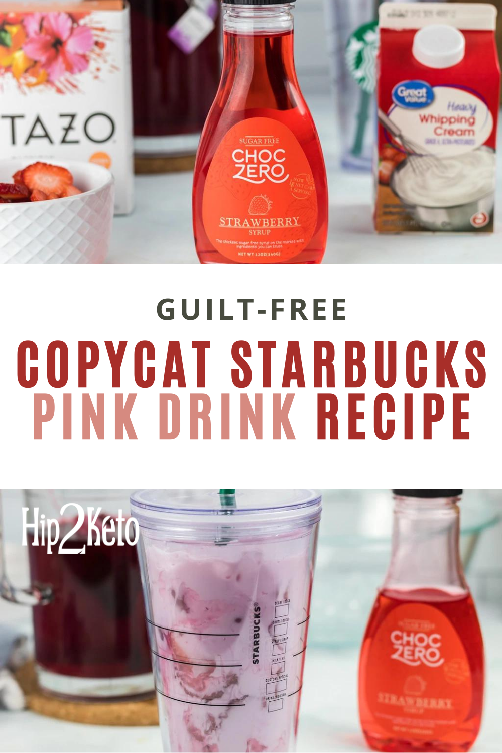 To get a delicious fruity flavor and sweetness without all the sugar, make sure to use a sugar-free strawberry syrup. Amazon has quite a few different options. Finding a good keto-friendly syrup is a huge win, especially since Starbucks packs a whopping 24 grams of sugar in their Grande Pink Drink. Yikes!