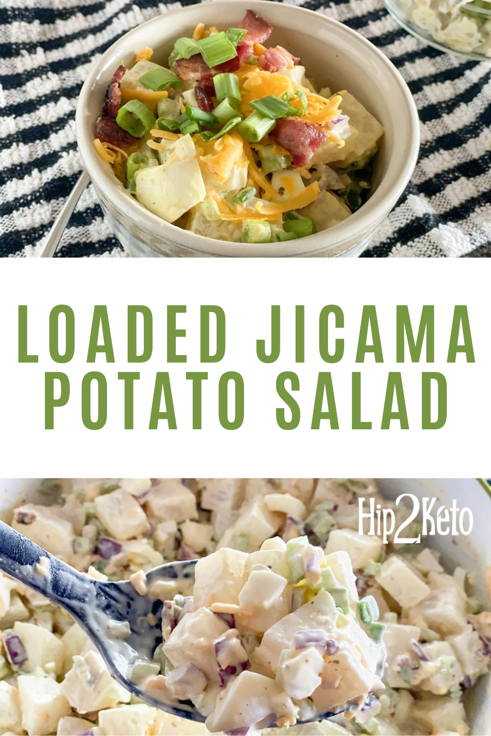 That’s right, potatoes are out and jicama is taking the spotlight! Once you cook jicama, dress it up with all the goodness that is potato salad, and then load it up with bacon, shredded cheddar, and green onions, how can you go wrong?!